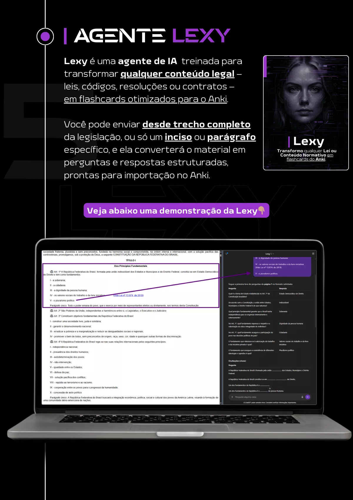 ✓ Agente Lexy, treinada para transformar qualquer Lei ou conteúdo Normativo em flashcards do Anki.