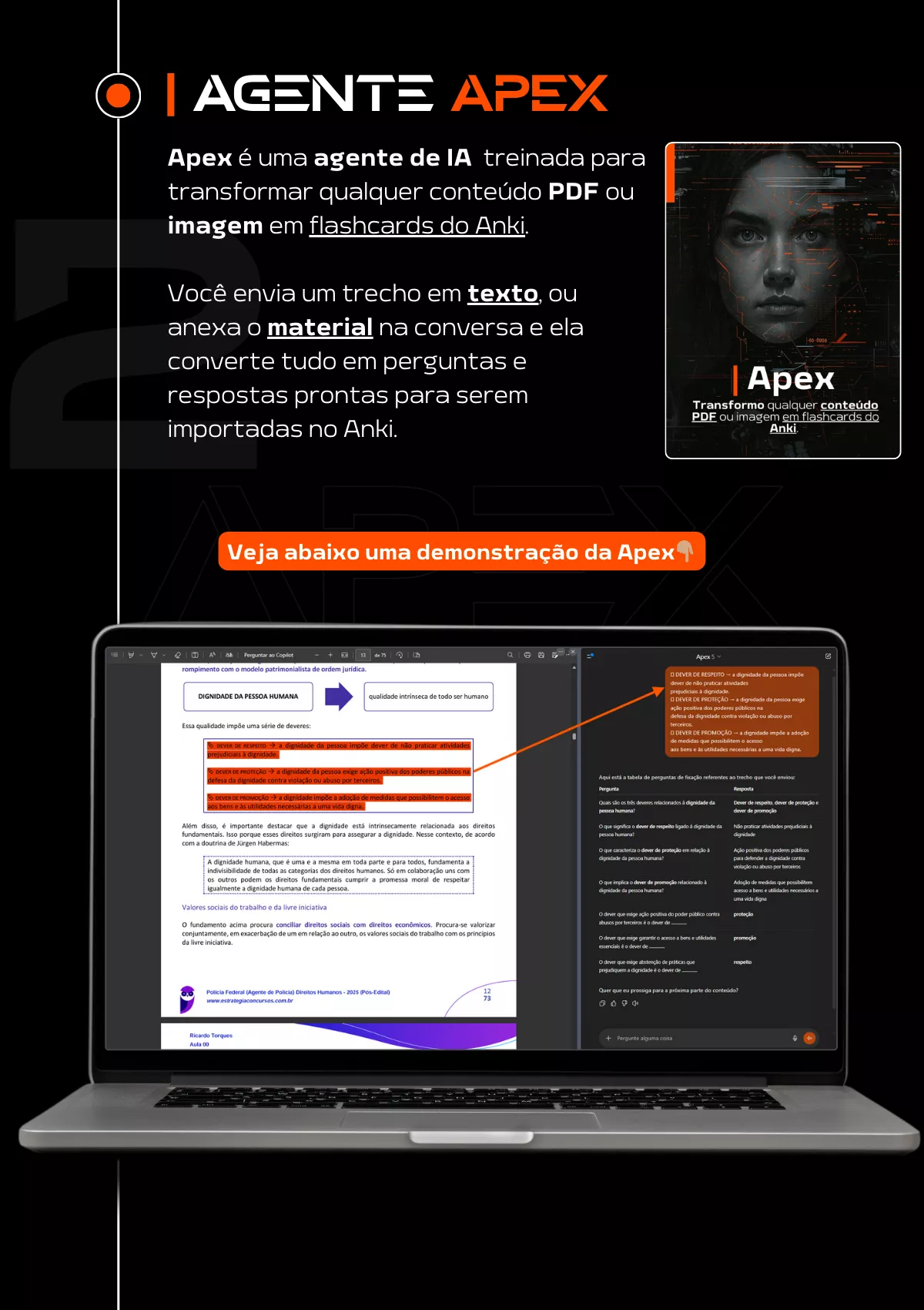 ✓ Agente Apex, treinada para transformar qualquer conteúdo PDF ou imagem em flashcards do Anki.